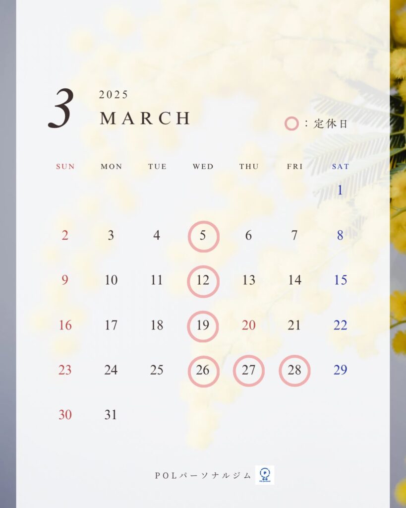 【3月営業日のお知らせ】 いつもPOLパーソナルジムをご利用いただきありがとうございます。 3月の営業日についてご案内いたします。 ■ 通常営業月曜〜日曜:10:00〜21:00(最終ご案内時間20:00) ※ご新規様は19:30までとなります ■ 定休日水曜日、他丸の... 肩こり